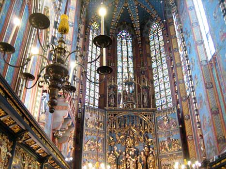 St mary's Basilica has a striking Gothic alterpiece, a vaulted ble ceiling, and windows by Wyspianski